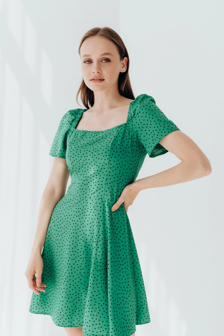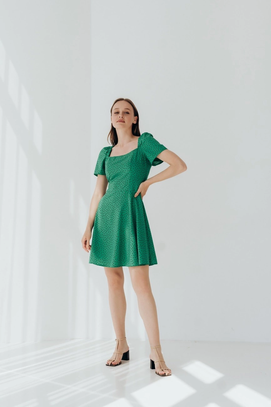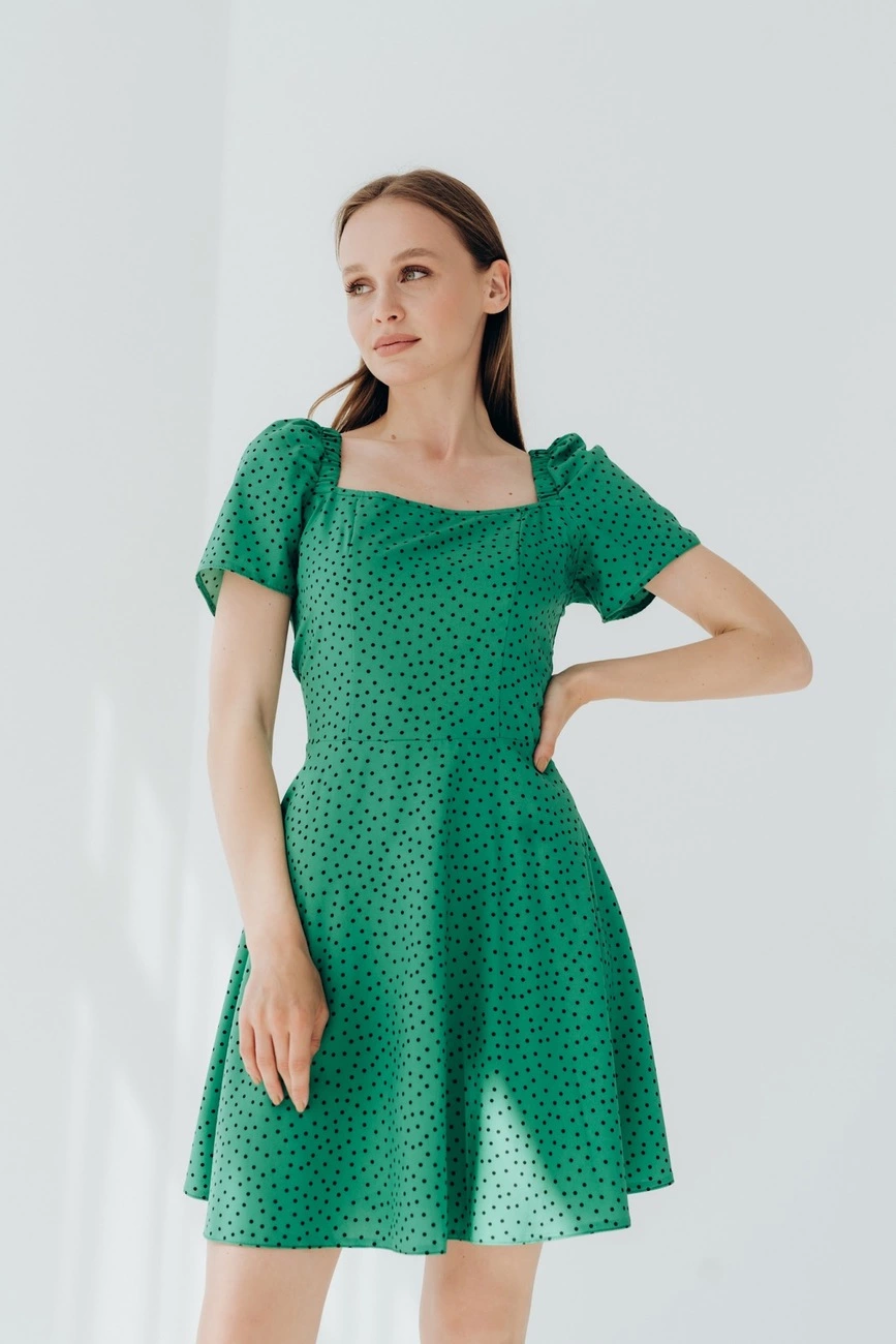 Ніжна міні сукня з коротким рукавом. Фасон підкреслює талію,