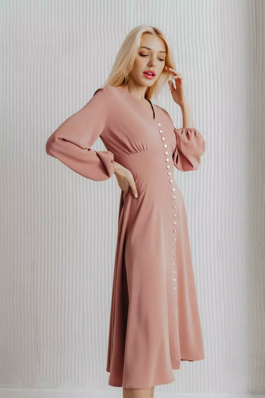 ґудзики по всій довжині. Фасон що підкреслює талію, міді довжина.