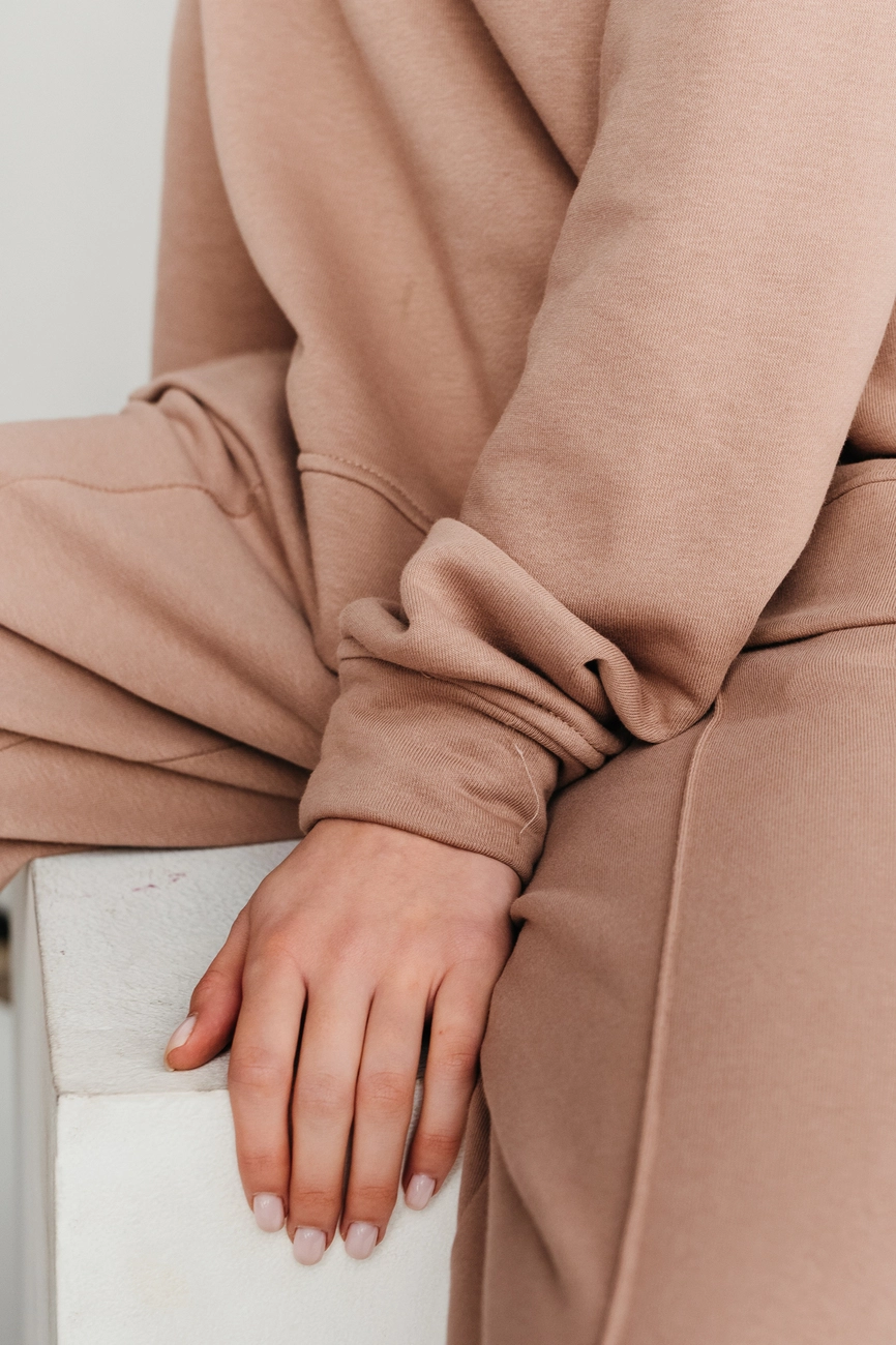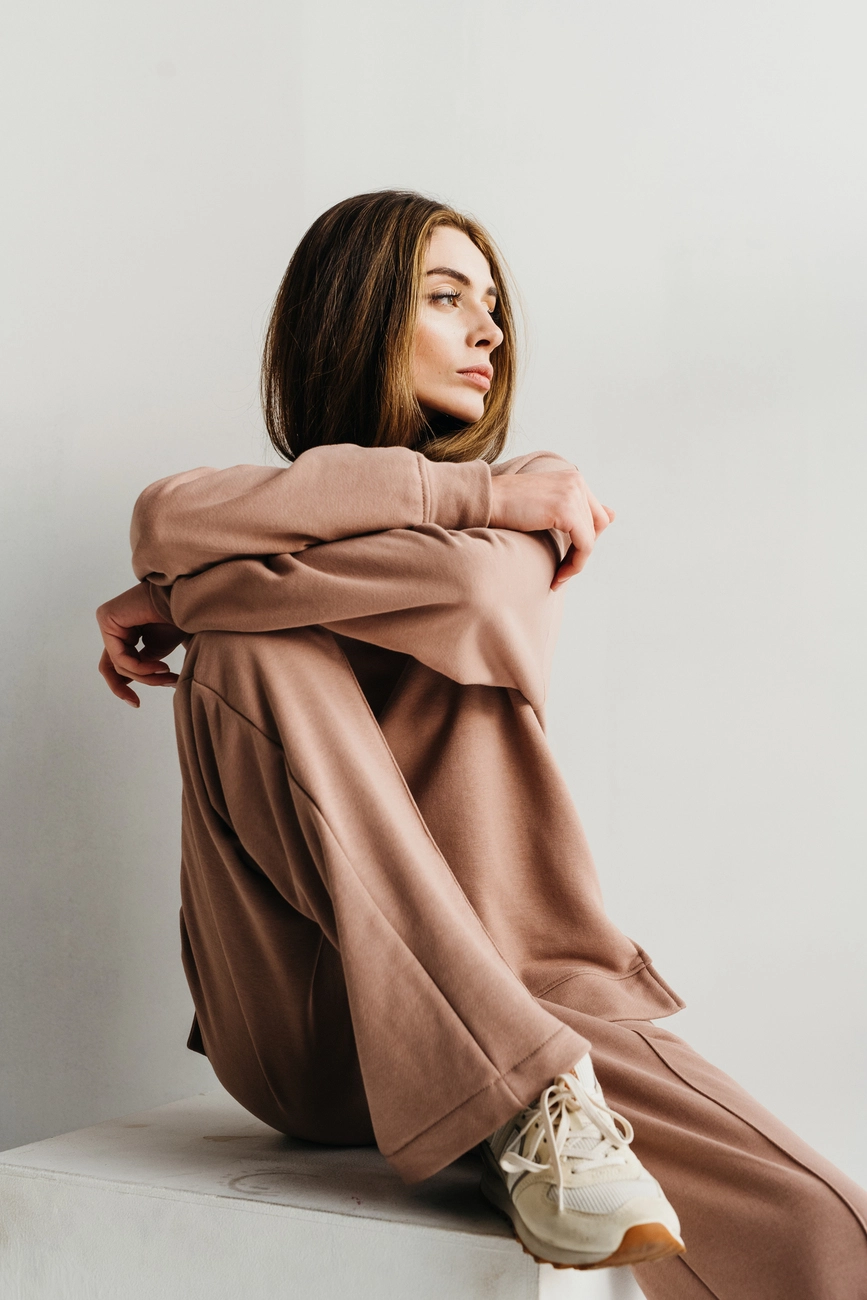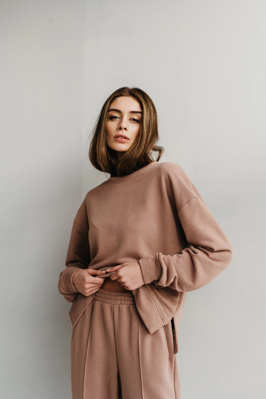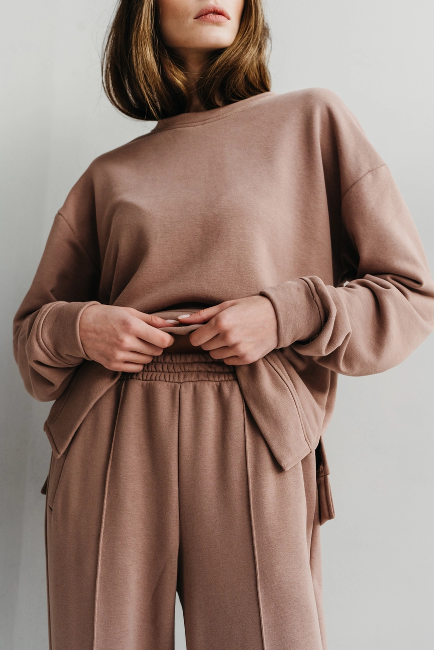 Зручний трикотажний костюм з вільним світшотом. Прямий крій штанів,